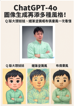 還在用一張正經八百的大頭照?現在只要上傳一張照片,搭配簡單的提示詞,就能讓 AI 幫你變身成 Q 版人物、蠟筆手繪風,甚至是超可愛布偶造型!