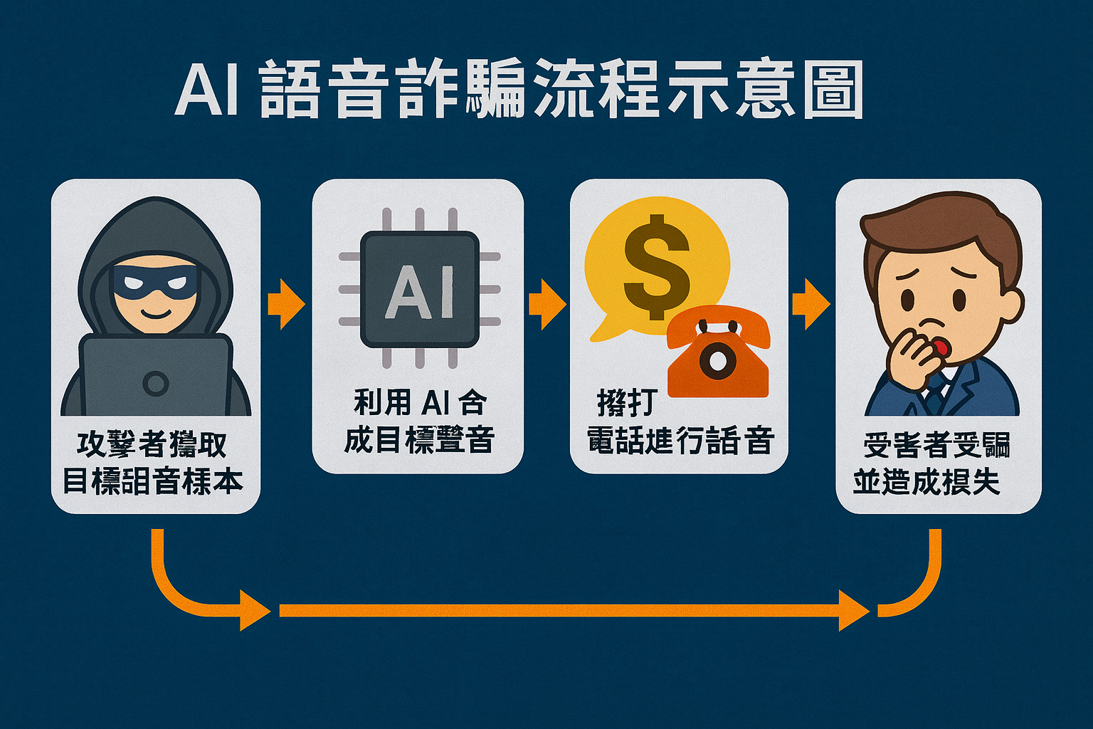 - 語音釣魚(Vishing): 利用合成語音自動撥打大量電話,誘導受害者透露個人資訊或銀行帳戶密碼。
