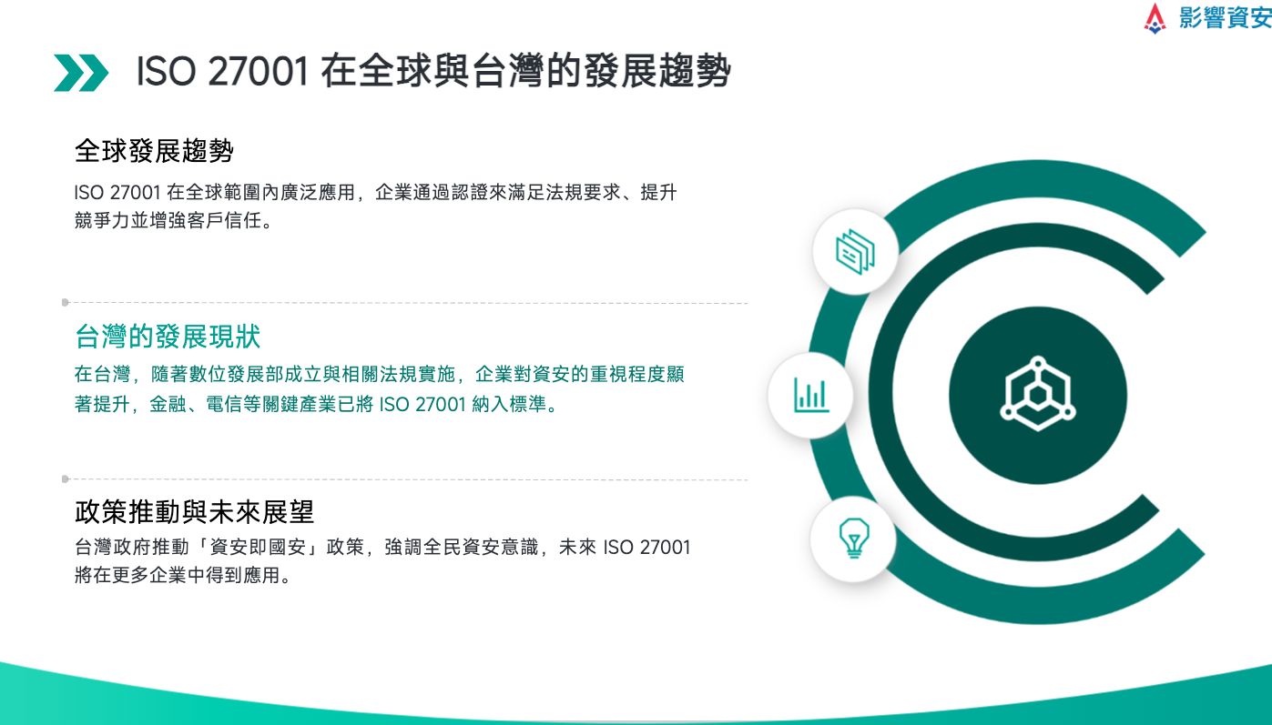 在台灣,隨著數位發展部成立、資通安全管理法的實施以及個資法的不斷完善,企業對資訊安全的意識也顯著提升。尤其是在金融、電信、高科技製造等關鍵基礎設施產業,導入 ISO 27001 已成為一種行業規範,甚至是法規要求。即使是中小企業,在面對客戶要求、供應鏈壓力或自身數位轉型的需求下,也逐漸將 ISO 27001 納入其發展藍圖。「資安即國安」的政策方針,更突顯了政府推動全民資安的決心。