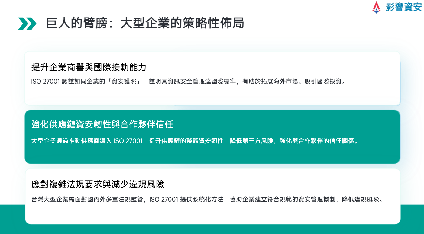 對於台灣的大型企業,特別是跨國企業、上市公司或產業龍頭,導入 ISO 27001 不僅是強化資安防護的必要措施,更是其全球化佈局和提升競爭力的重要策略。