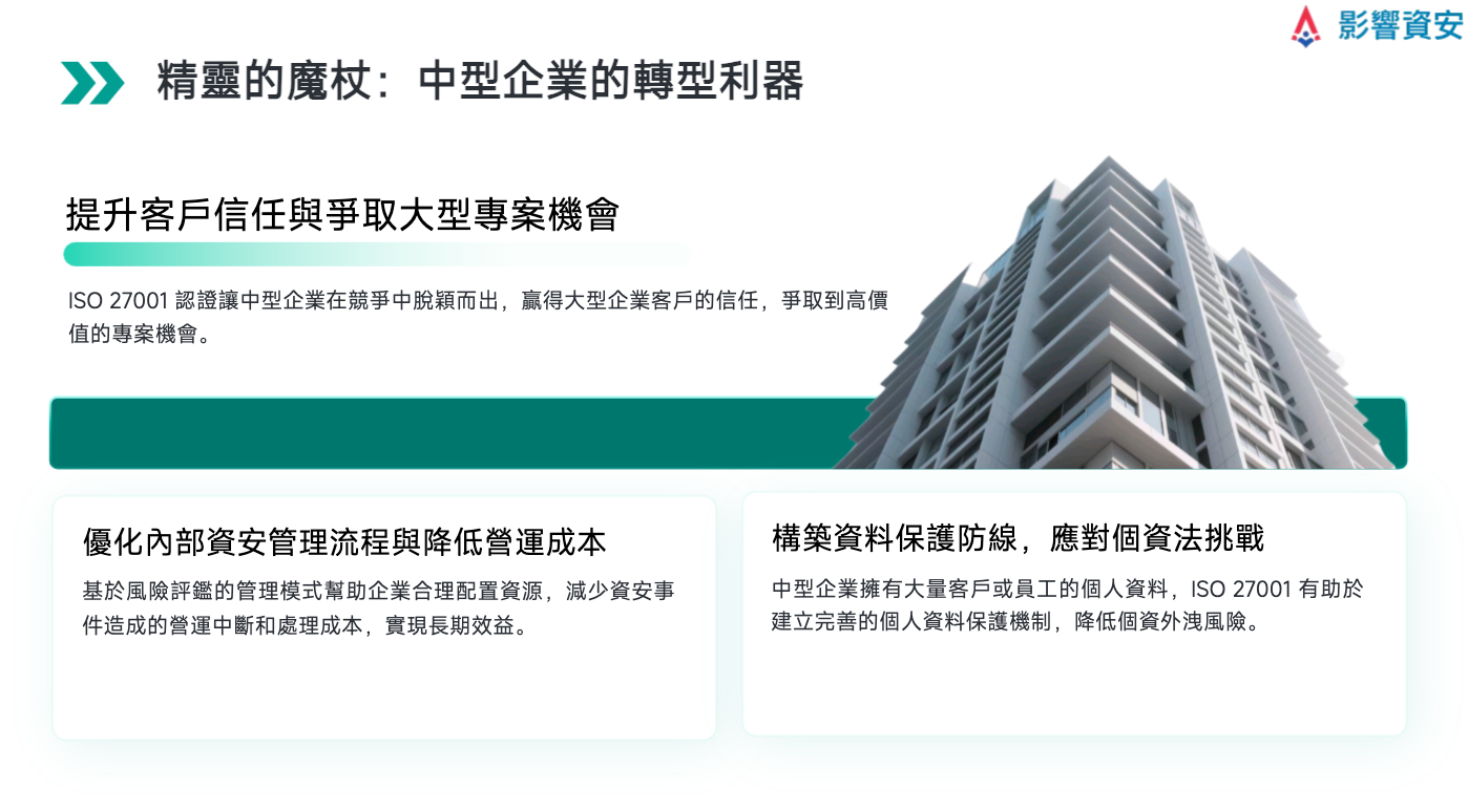 台灣的中型企業是經濟發展的骨幹,它們通常處於快速成長期,面臨著擴大業務規模、爭取更大客戶的挑戰。導入 ISO 27001 對於中型企業而言,是一把開啟新機會的「魔杖」。