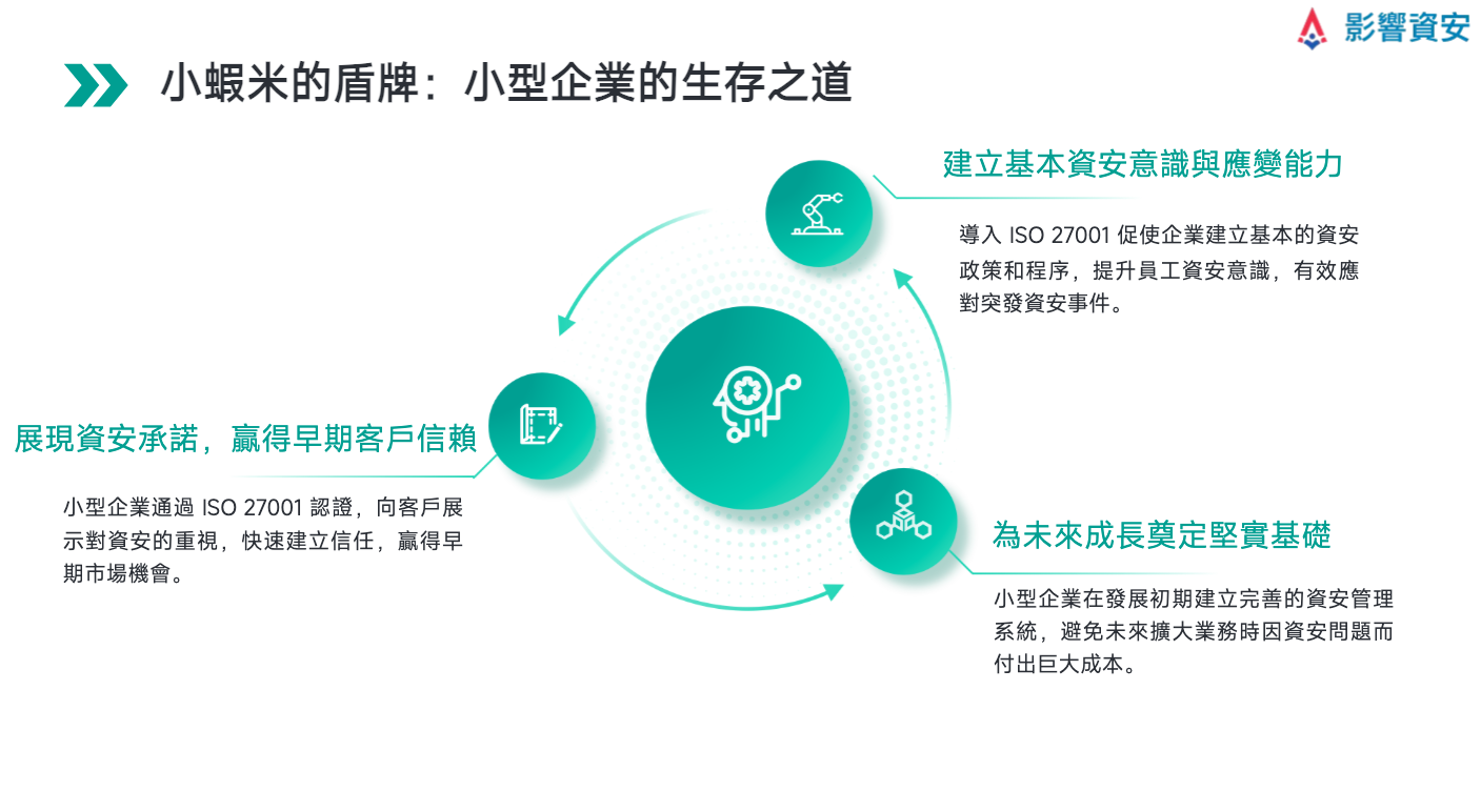 對於資源相對有限的小型企業,特別是新創公司或微型企業,資安問題可能常被忽略或認為是「大公司的煩惱」。然而,事實上,小型企業因其資安防護較弱,更容易成為駭客攻擊的目標。導入 ISO 27001,就像為「小蝦米」築起一道堅固的「盾牌」。