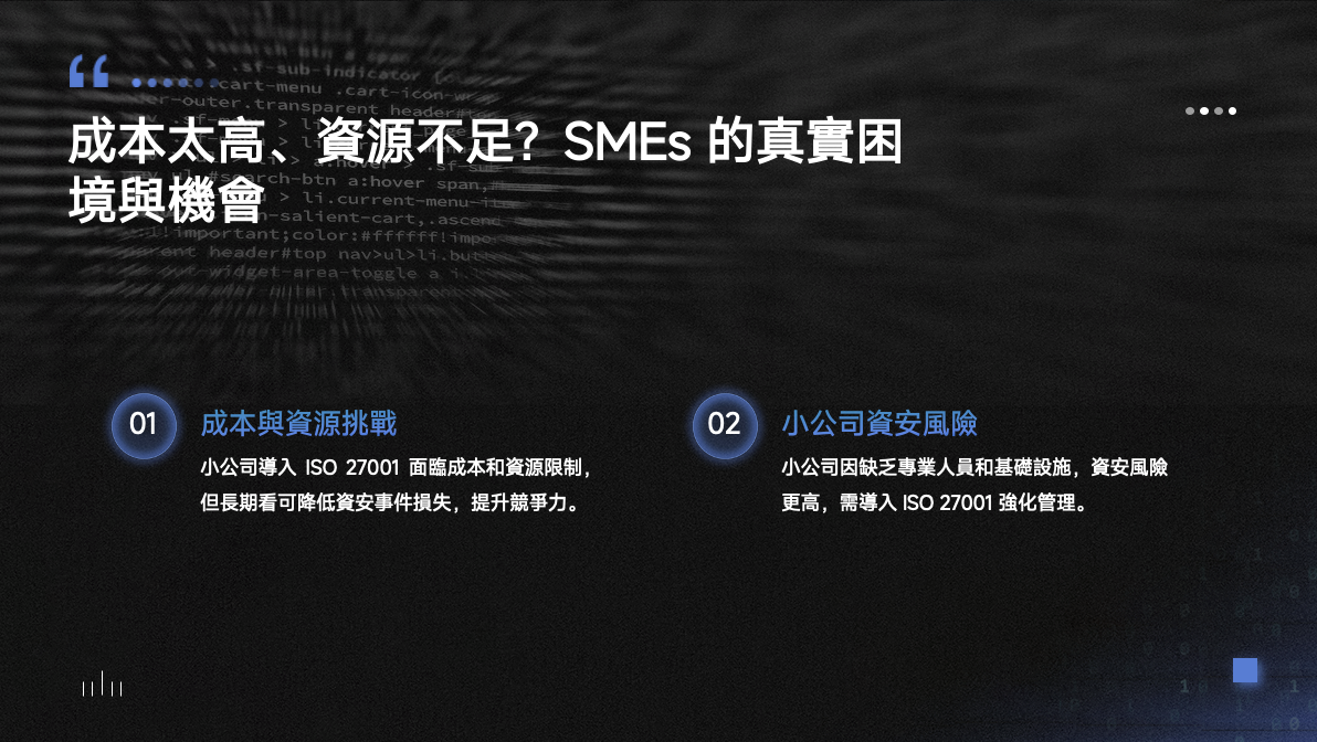 「我們公司太小了,不會被駭客盯上吧?」、「ISO 27001 是大企業的事,我們沒有那麼多資源和預算。」這是許多中小型企業 (Small and Medium-sized Enterprises, SMEs) 在面對資訊安全議題時常有的心態。然而,在日益數位化的今天,這種觀念已是嚴重的資安迷思