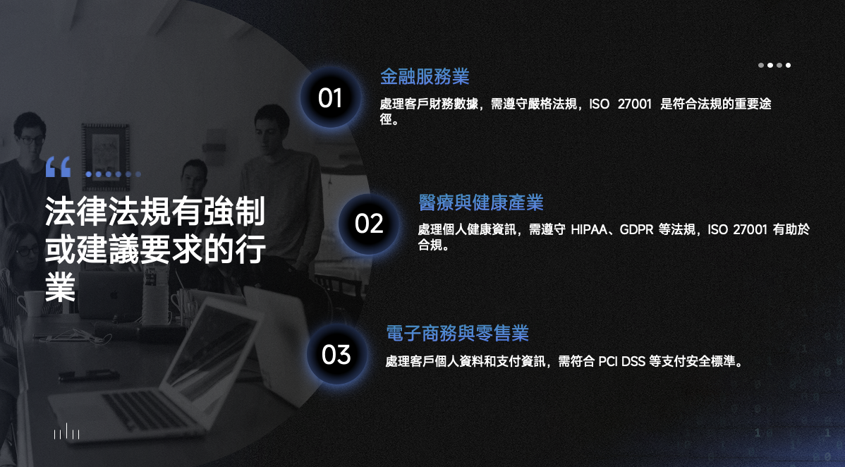 某些行業因其業務性質,需要處理大量敏感數據,因此受到嚴格的法律法規監管。對這些行業而言,導入 ISO 27001 往往是滿足合規要求的重要途徑。