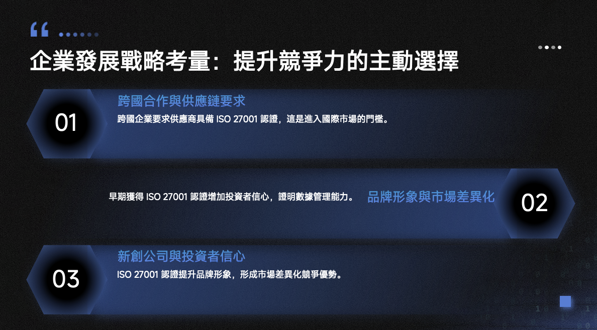 • 競爭優勢的建立: 當市場普遍缺乏資安標準時,率先取得 ISO 27001 認證的小公司,能夠在客戶、合作夥伴面前建立獨特的信任優勢,這將帶來更多的商業機會。