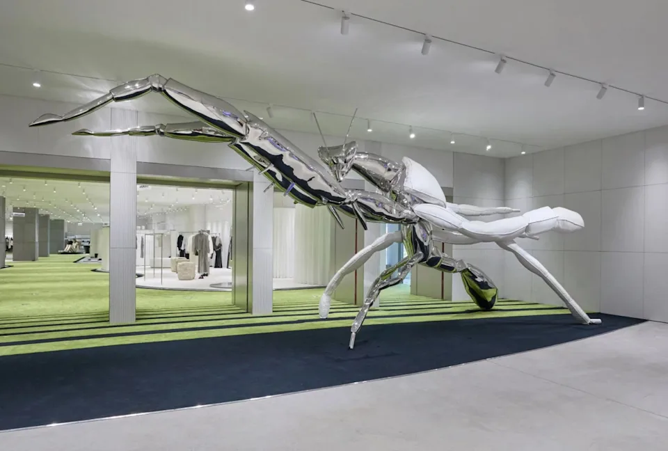 《Gentle Monster》深諳「吸引大眾眼球」之道。他們直接將超大型藝術裝置搬進商場,例如深圳店中斜躺在挑高中庭的沉睡巨人、張牙舞爪的巨型螳螂與野牛。這些裝置不僅是擺設,更是透過迷幻燈光與音效,形成一種超現實的視覺衝擊與空間敘事。這種大膽的設計不僅具備「視覺磁鐵」效應,更透過其獨特的怪誕美學,將品牌識別度提升至全新高度。