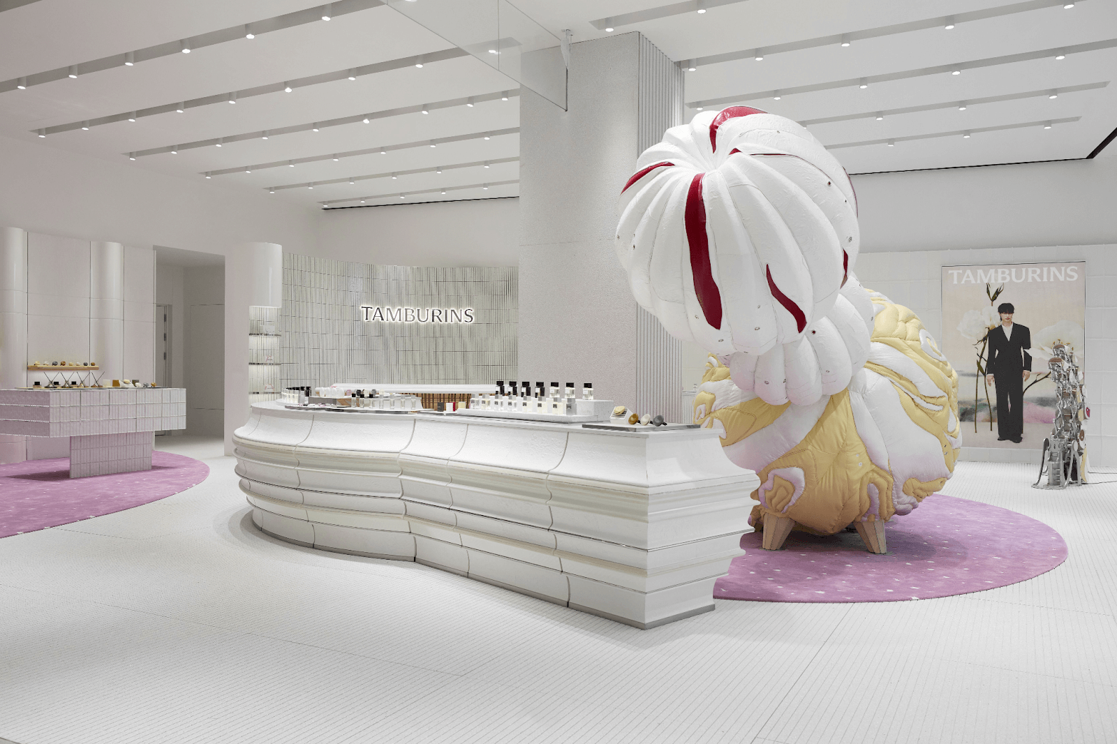 《Gentle Monster》不僅僅陳列品牌全系列眼鏡,更策略性地引入了香氛品牌《Tamburins》、服裝品牌《LOW CLASSIC》等多個高端品牌進駐。這種跨領域的商品聯手,打破了單一零售門市的界限,讓消費者在穿梭於藝術裝置與品牌貨架之間時,能強烈感受到空間所帶來的驚喜與多樣性。
