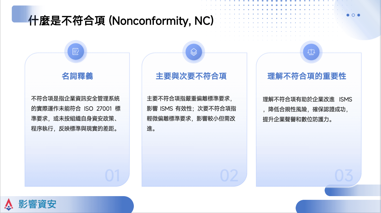 - ISMS 的改進機會: 不符合項是 ISMS 弱點的指示器。透過矯正這些問題,企業能實質性地提升資安防護能力。