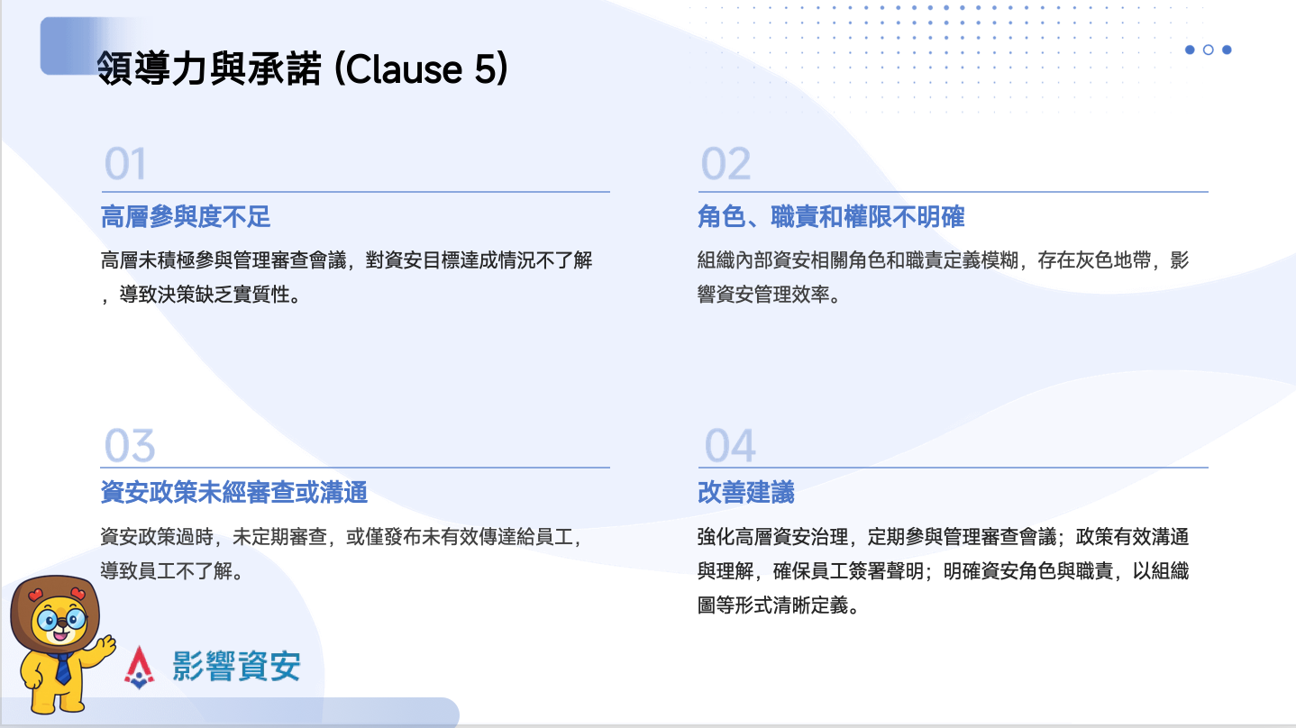 - 高層參與度不足: 管理審查會議流於形式,高層未積極參與討論或做出實質性決策,對資安目標達成情況不了解。