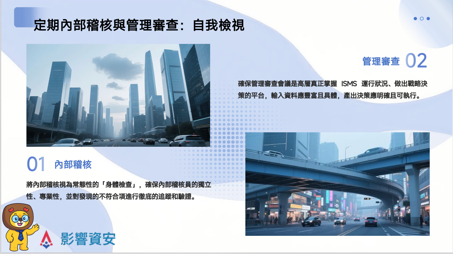 - 管理審查: 確保管理審查會議是高層真正掌握 ISMS 運行狀況、做出戰略決策的平台。輸入資料應豐富且具體,產出決策應明確且可執行。