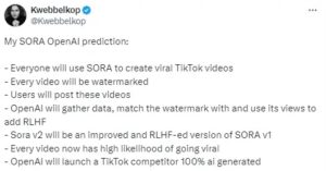 Sora 問世後,網上出現了許多有關 OpenAI 未來計劃的猜測。AI 內容創作者“Kwebbelkop”指出,OpenAI 將通過收集用戶發布的 Sora 視頻數據來進行模型微調,使 Sora 變得更加強大。同時,OpenAI 還將通過收集這些視頻的觀看數據來增強 Sora 的強化學習自人類反饋算法,這意味著每個人都能輕鬆創造出社交媒體熱門視頻。而這一切只是未來的開始。